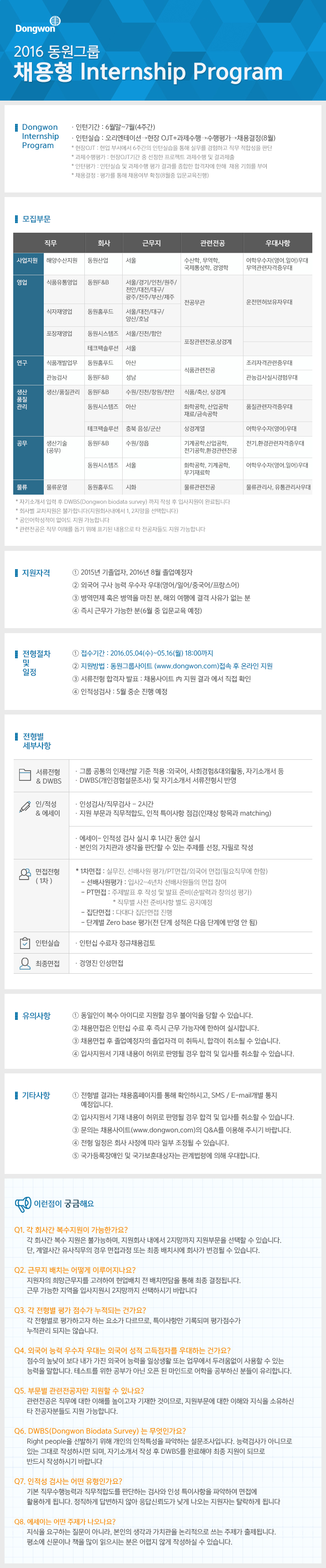 2016년 동원그룹 채용형 Internship Program을 아래와 같이 모집합니다. 많은 관심 및 지원 바랍니다.