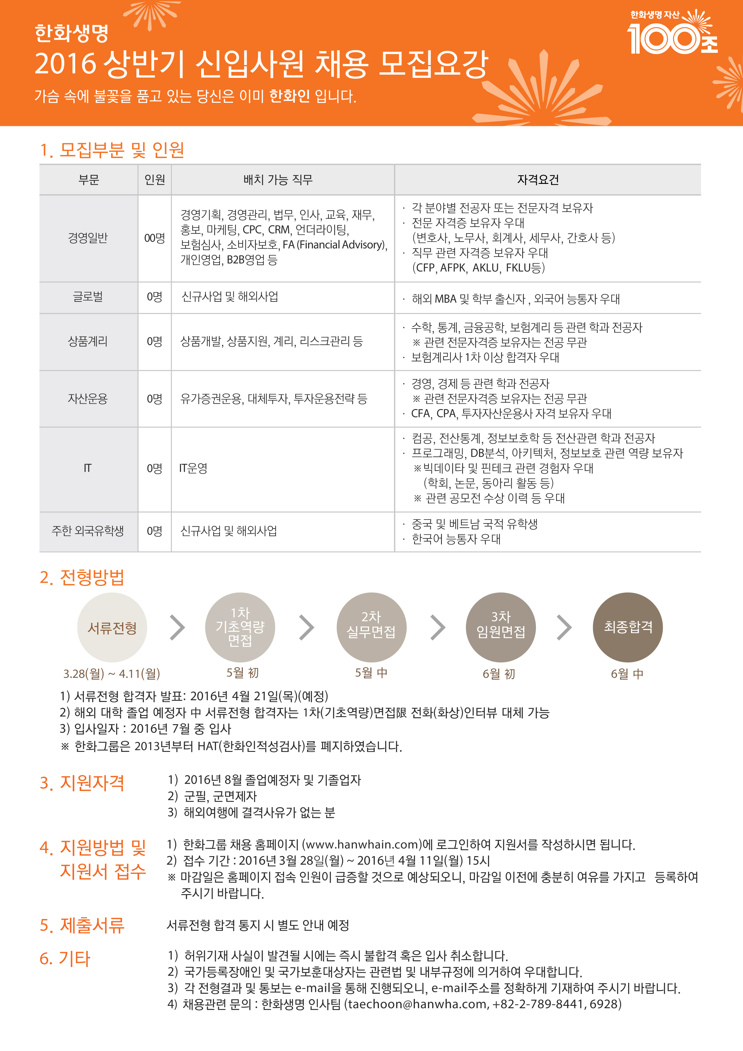 -채용관련 문의: 한화생명 인사팀 (taechoon@hanwha.com, +82-2-789-8441, 6928)