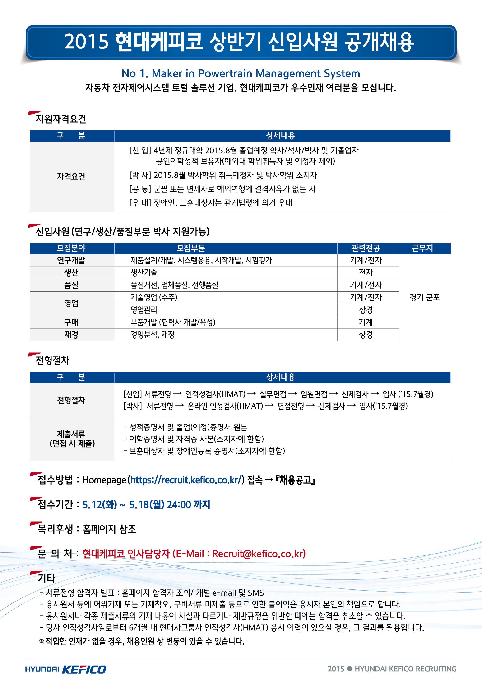 [현대케피코] 2015 상반기 신입사원 공개채용(기계/전자)