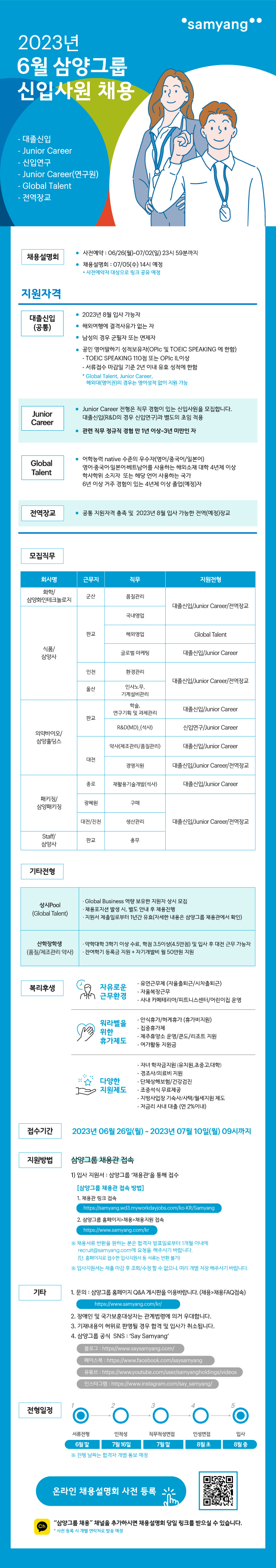 • Global Business역량 보유한 지원자 상시 모집 •채용포지션 발생 시,별도 안내 후 채용진행 •지원서 제출일로부터1년간 유효(자세한 내용은 삼양그룹 채용관에서 확인) |