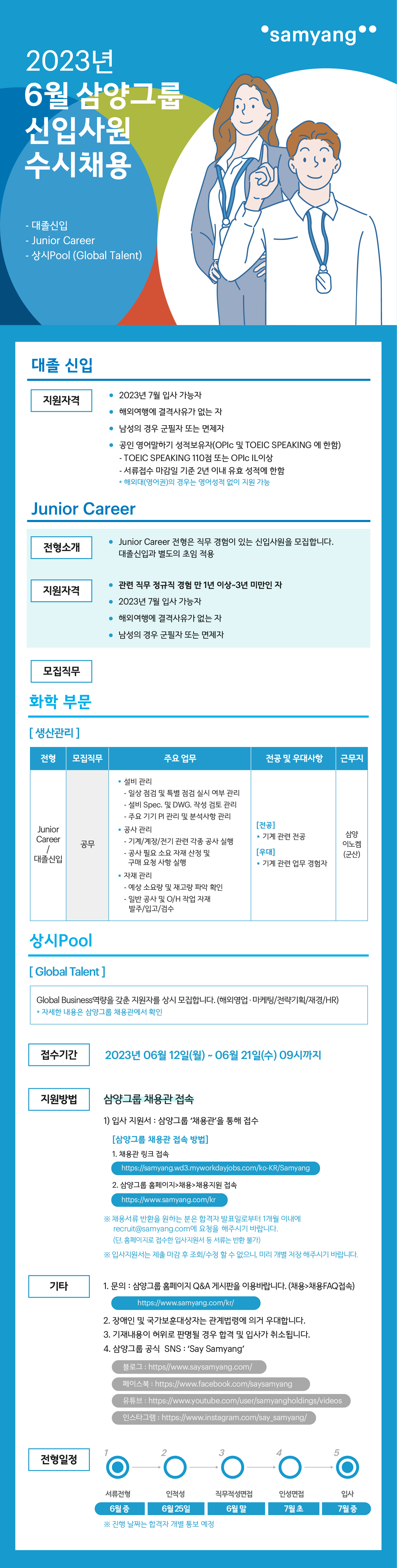 Global Business역량을 갖춘 지원자를 상시 모집합니다. (해외영업·마케팅/전략기획/재경/HR) *자세한 내용은 삼양그룹 채용관에서 확인 |