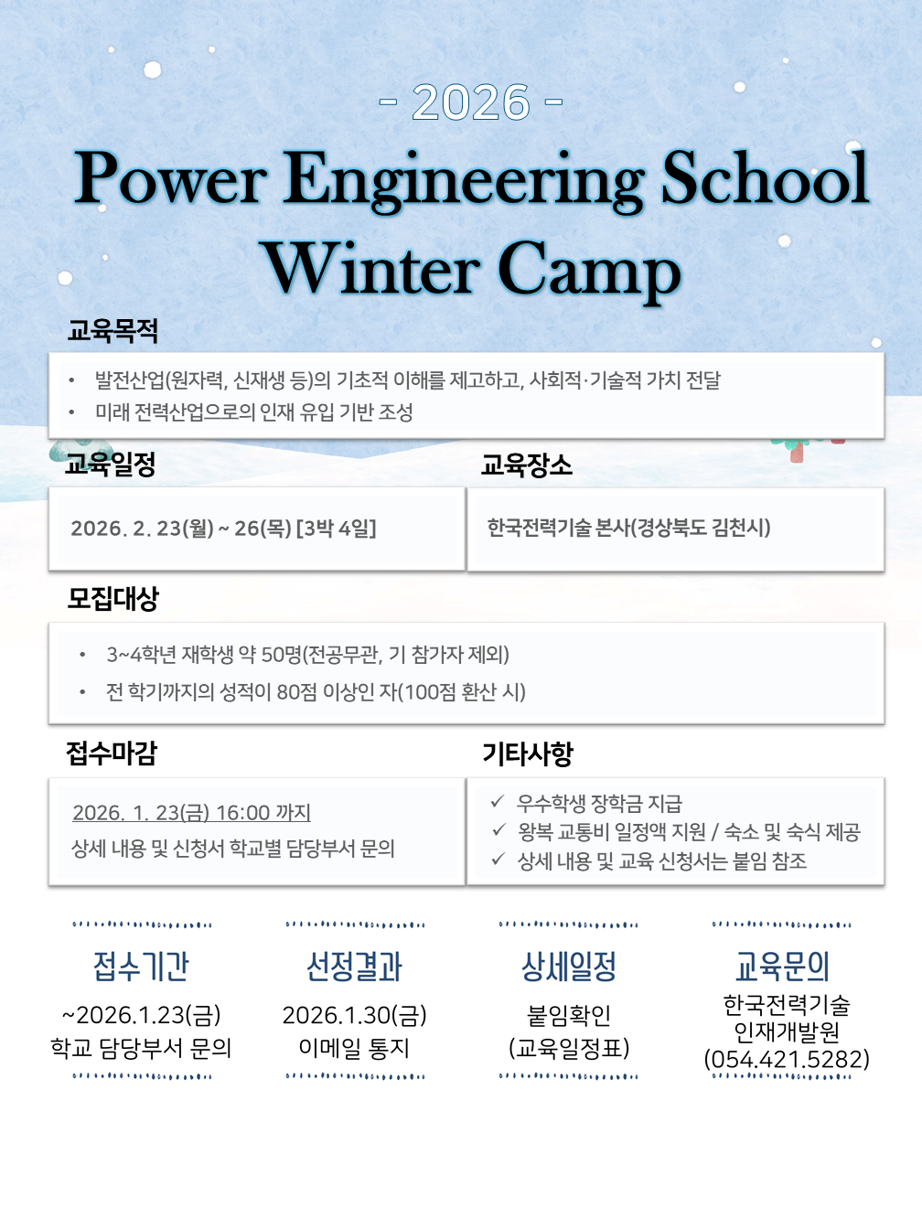 ![- 2026 - Power Engineering School Winter Camp 교육목적 발전산업(원자력, 신재생 등)의 기초적 이해를 제고하고, 사회적·기술적 가치 전달 미래 전력산업으로의 인재 유입 기반 조성 교육일정 교육장소 2026.2.23(월) ~ 26(목) [3박4일] 한국전력기술 본사(경상북도 김천시) 모집대상 • 3~4학년 재학생 약 50명(전공무관, 기 참가자 제외) • 전학기까지의 성적이 80점 이상인 자(100점 환산시) 접수마감 2026. 1. 23(금) 16:00 까지 상세 내용 및 신청서 학교별 담당부서 문의 기타사항 √ 우수학생 장학금 지급 √ 왕복 교통비 일정액 지원/ 숙소 및 숙식 제공 √ 상세 내용 및 교육 신청서는 붙임 참조 010...... 접수기간 ~2026.1.23() 학교 담당부서 문의 선정결과 상세일정 교육문의 2026.1.30() 붙임확인 한국전력기술 이메일 통지 (교육일정표) 인재개발원 (054.421.5282)](http://www.gist.ac.kr/_prog/download/?editor_image=20260108162033783_M3A5Q1JD.png)