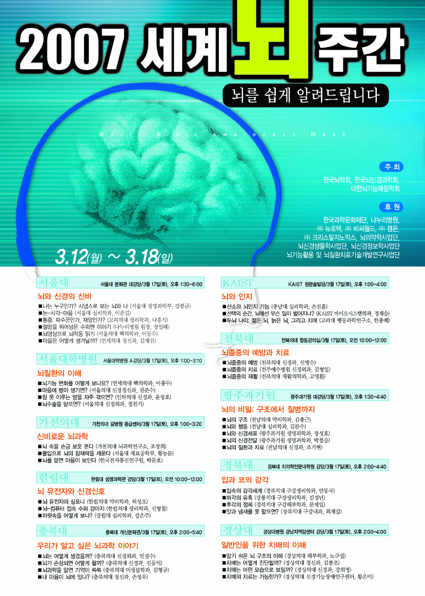 세계 뇌 주간(World Brain Awareness Week) 행사는 일반인에게 뇌의 중요성을 알리기 위해 지난 92년 미국에서 시작된 것으로 세계 각국이(현재 57개국) 매년 3월 셋째 주에 뇌를 알리는 다양한 행사를 동시에 개최하고 있다. <홍보협력팀, 2007.3.12>