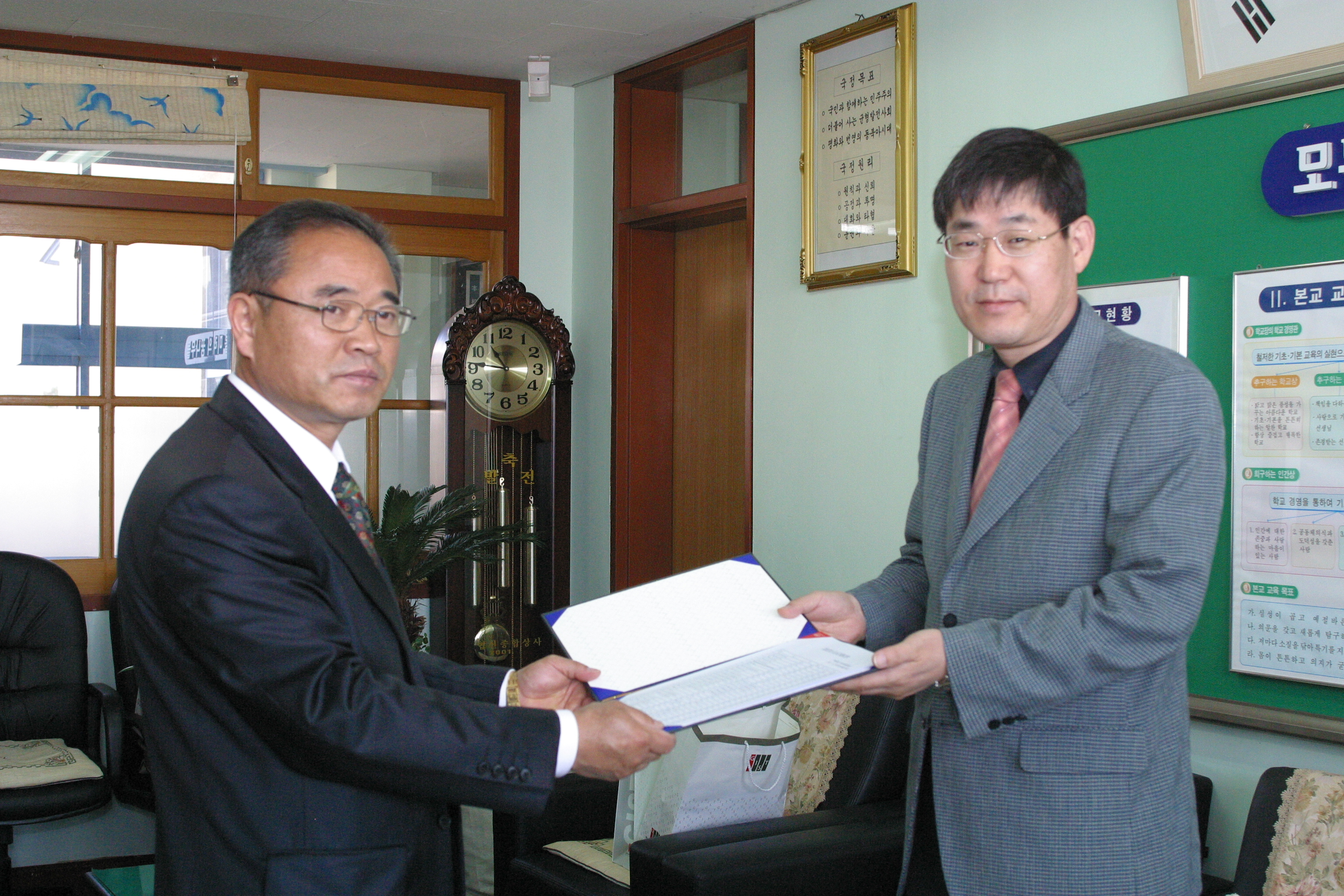 <사진설명 : 류제하 기획처장(우측)이 이근중 비아초등학교장에게 도서기증서를 전달하고 있다.>