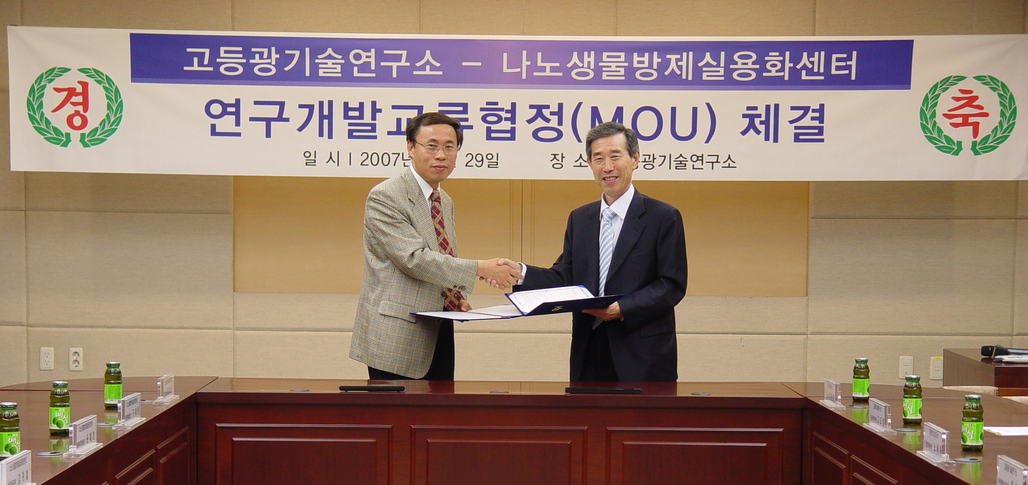 광주과학기술원(GIST, 원장직무대행 문승현) 고등광기술연구소(APRI, 소장 이종민)는 지난 29일 전남 장성에 위치한 (재)전남생물산업진흥재단 나노생물방제실용화센터(소장 이재의)와 연구개발 교류협정(MOU)를 체결했다.
