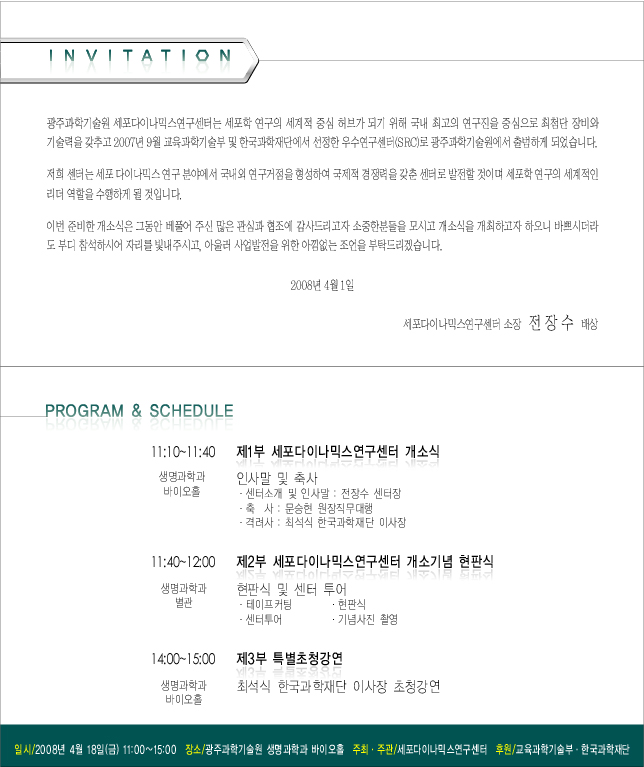 The Cell Dynamics Research Center(Director, Prof. Chun, Jang Soo) will have a Opening Ceremony of Center on April 18, 2008 at Jukhyun Bio Auditorium.