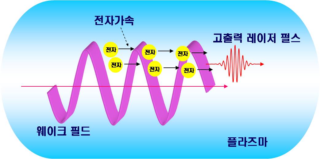 일반적인 전자빔 가속 기술과 달리 레이저 웨이크필드 가속 기술은 고출력 레이저 펄스를 이온화된 가스 상태인 플라즈마에 조사하여 레이저 펄스와 같은 방향으로 진행하는 플라즈마 파동을 발생시키고, 이 플라즈마 파동에 전자빔을 실어 가속시키는 원리이다.