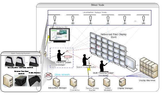 김 교수팀은 어제 지스트에서 열린 협업환경 구축기술 관련 워크숍에서 다중 지점들 간에 지능형 협업환경(SMeet: Smart Meeting Space) 시스템을 시연했다. 시연회에서는 네트워크로 연결된 지스트 내부에 소재한 두 개의 회의실(SMeet 협업환경)을 이용해 양측에 위치한 다수의 연구원들이 인터랙티브하게 서로의 모습과 발표자료 및 동영상 등을 초고해상도 네트워크 디스플레이(networked tiled display)를 통해 공유하면서 기술 토론회를 진행하는 형식으로 이루어졌다. 이때 멀티 트래커는 토론회를 진행하는 과정에서 디스플레이를 중심으로 구성되는 전체적인 협업환경과 개별적인 사용자와의 인터랙션을 연계하는 효과적인 고리로 활용될 수 있음을 입증했다.