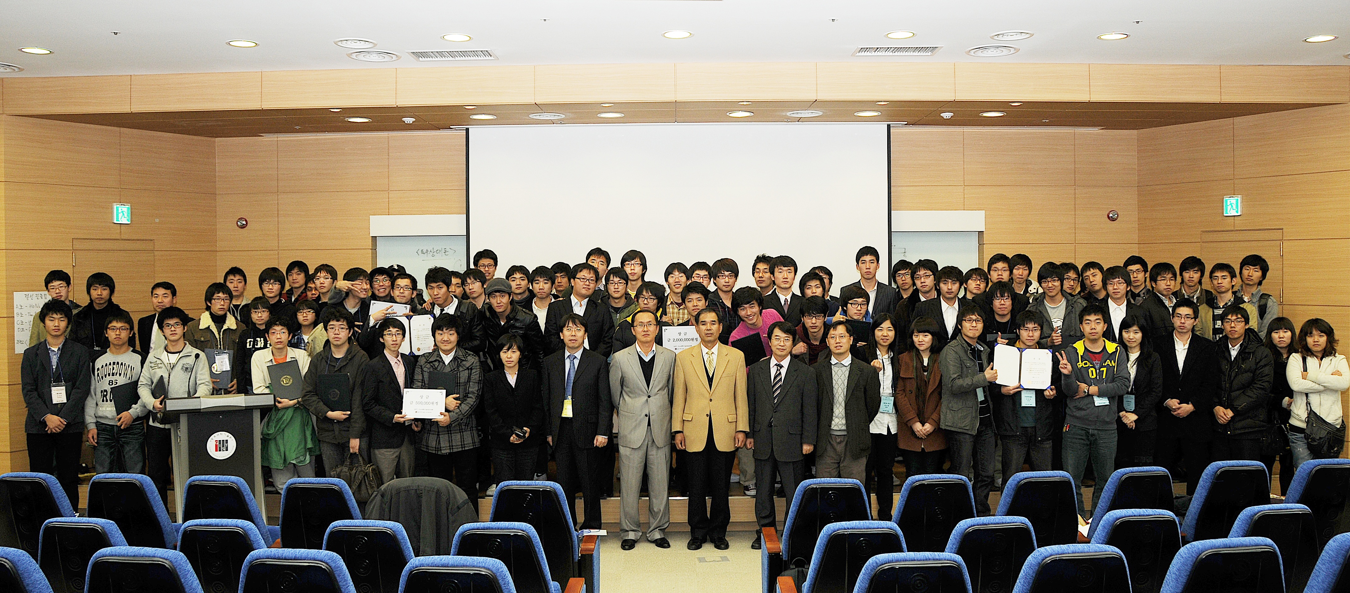 <사진설명: 2008 나노과학기술경진대회에 참가한 참가자들과 이대회를 주최한 신소재공학과 교수들이 시상식이 끝난 후 함께 기념촬영을 하고 있다.>