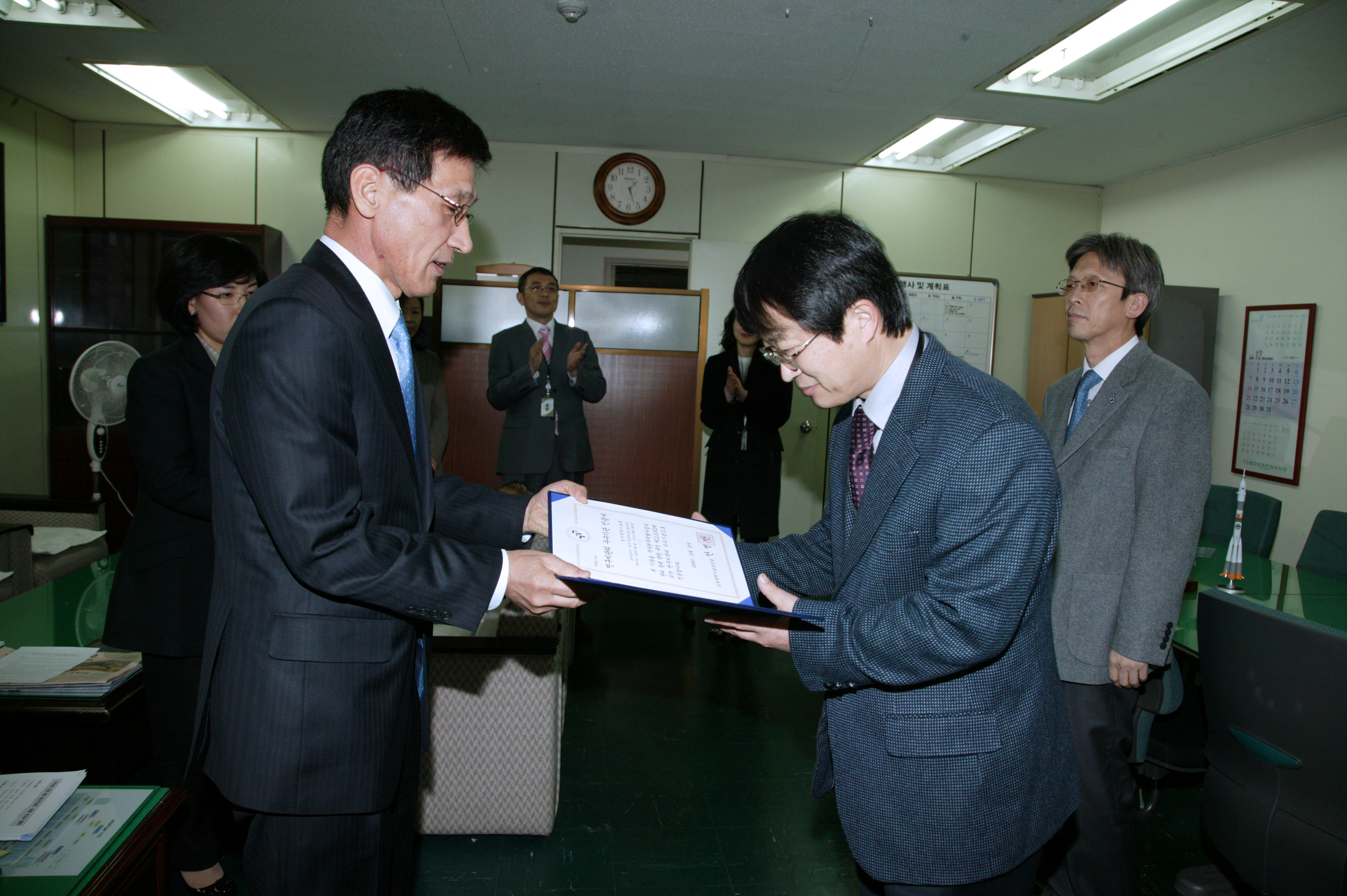 <사진설명: 이상목 교과부 과학기술정책실장(사진 좌측)이 이재석 광주과기원 산학협력단장에게 차관실에서 연구비관리 우수기관 인증서를 수여하고 있다.>
