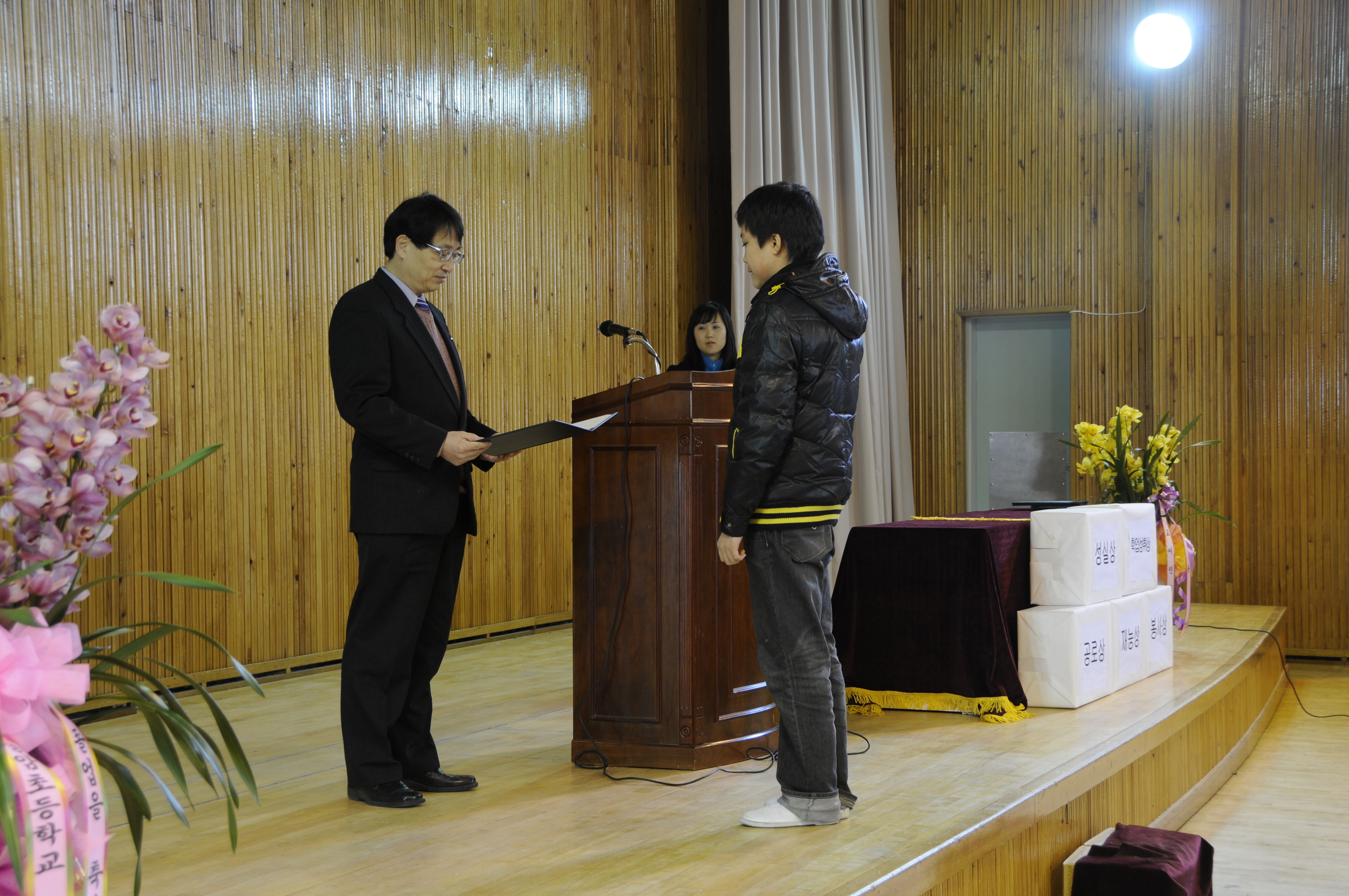 <사진설명 : 광주과기원 한원택 기획처장이 17일 정암초등학교 졸업식에 참석해 김안수 어린이에게 광주과학기술원장상과 장학금을 전달하고 있다.>