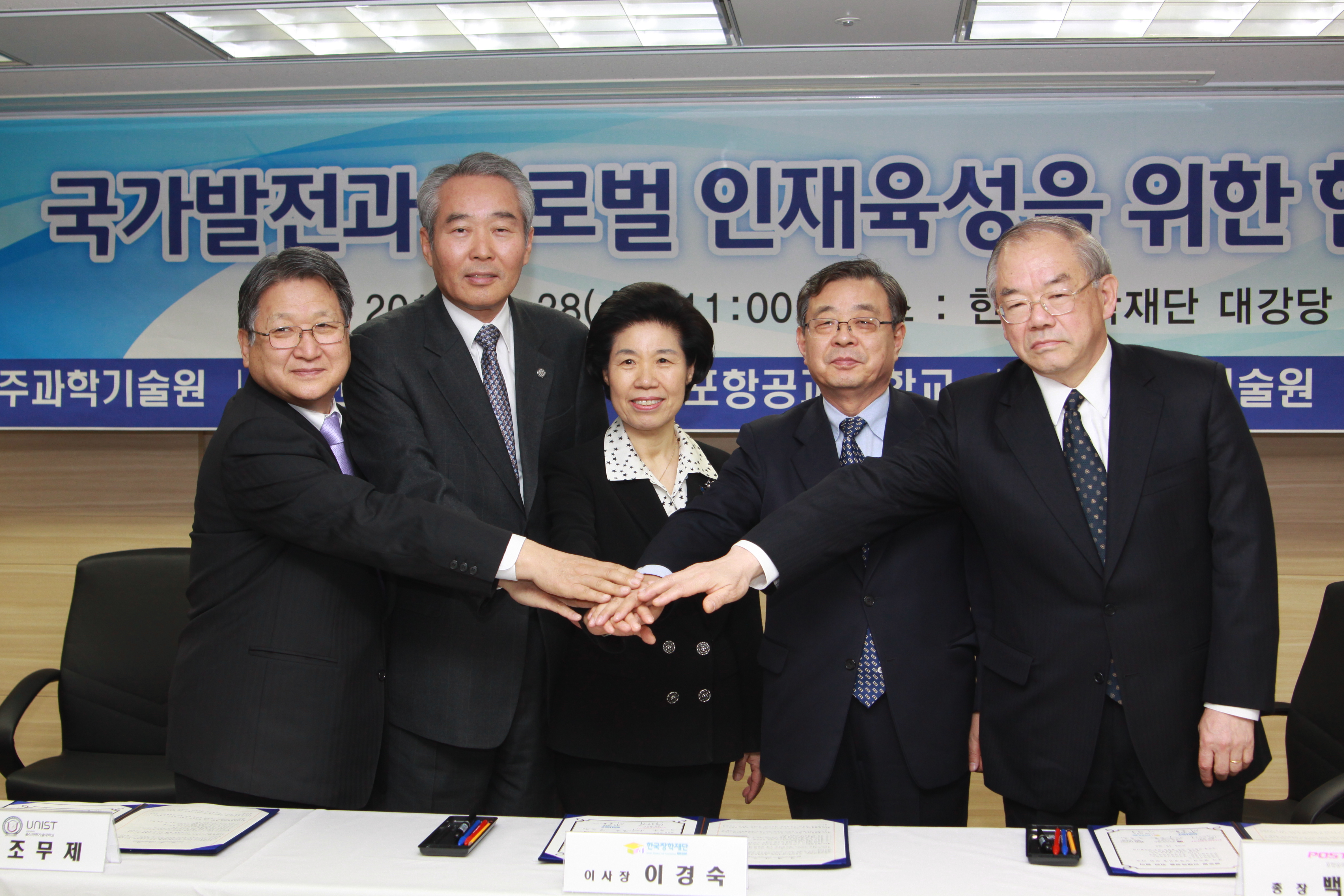 한국장학재단과 광주과학기술원(GIST), 울산과학기술대학교(UNIST), 포항공과대학교(POSTECH), 한국과학기술원(KAIST) 등 4개 이공계중점대학은 인재육성사업 공동추진에 대한 포괄적 업무제휴에 합의하고, ’10. 4. 28(수) 서울시 중구에 위치한 한국장학재단 대강당에서 업무협약을 체결했다.