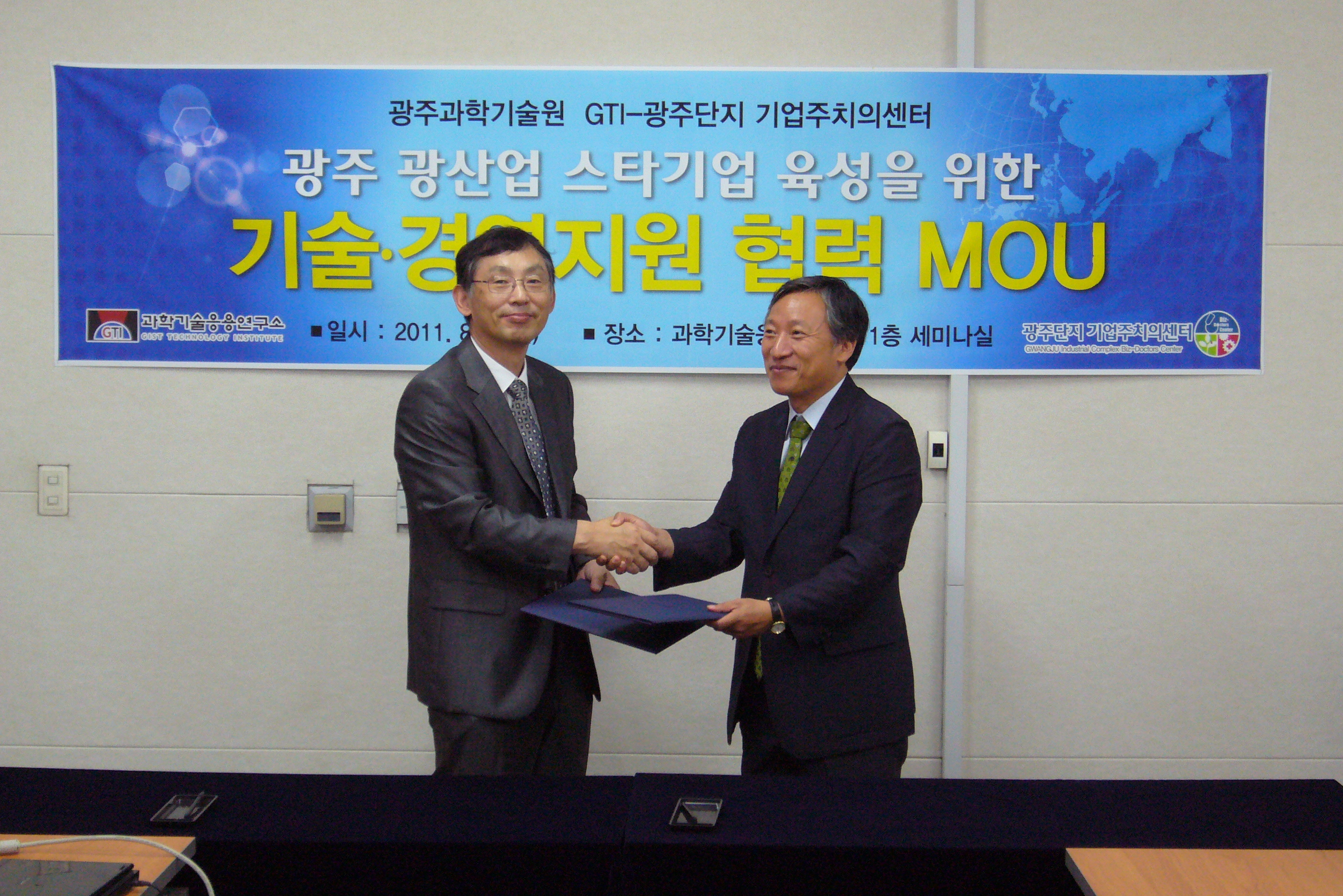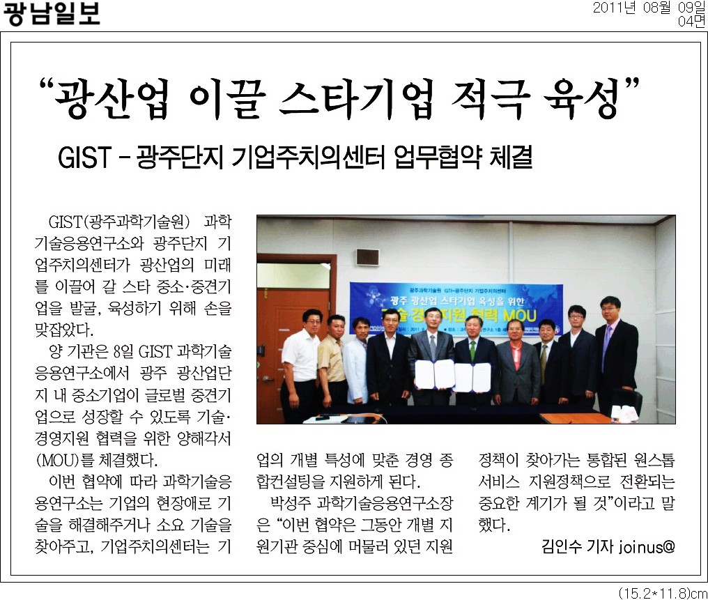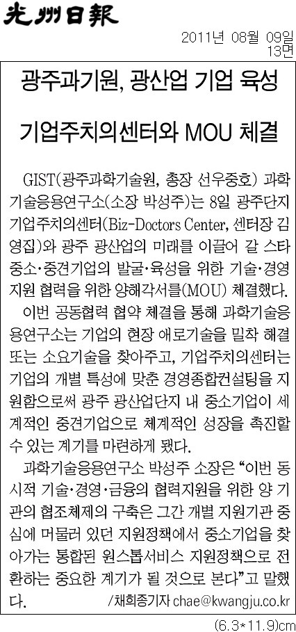 □ GIST(광주과학기술원, 총장 선우중호) 과학기술응용연구소(소장 박성주)는 지난 8일 광주단지 기업주치의센터(Biz-Doctors Center, 센터장 김영집)와 광주 광산업의 미래를 이끌어 갈 스타 중소․중견기업의 발굴․육성을 위한 기술․경영 지원 협력을 위한 양해각서를(MOU) 체결하였다고 발표했다.