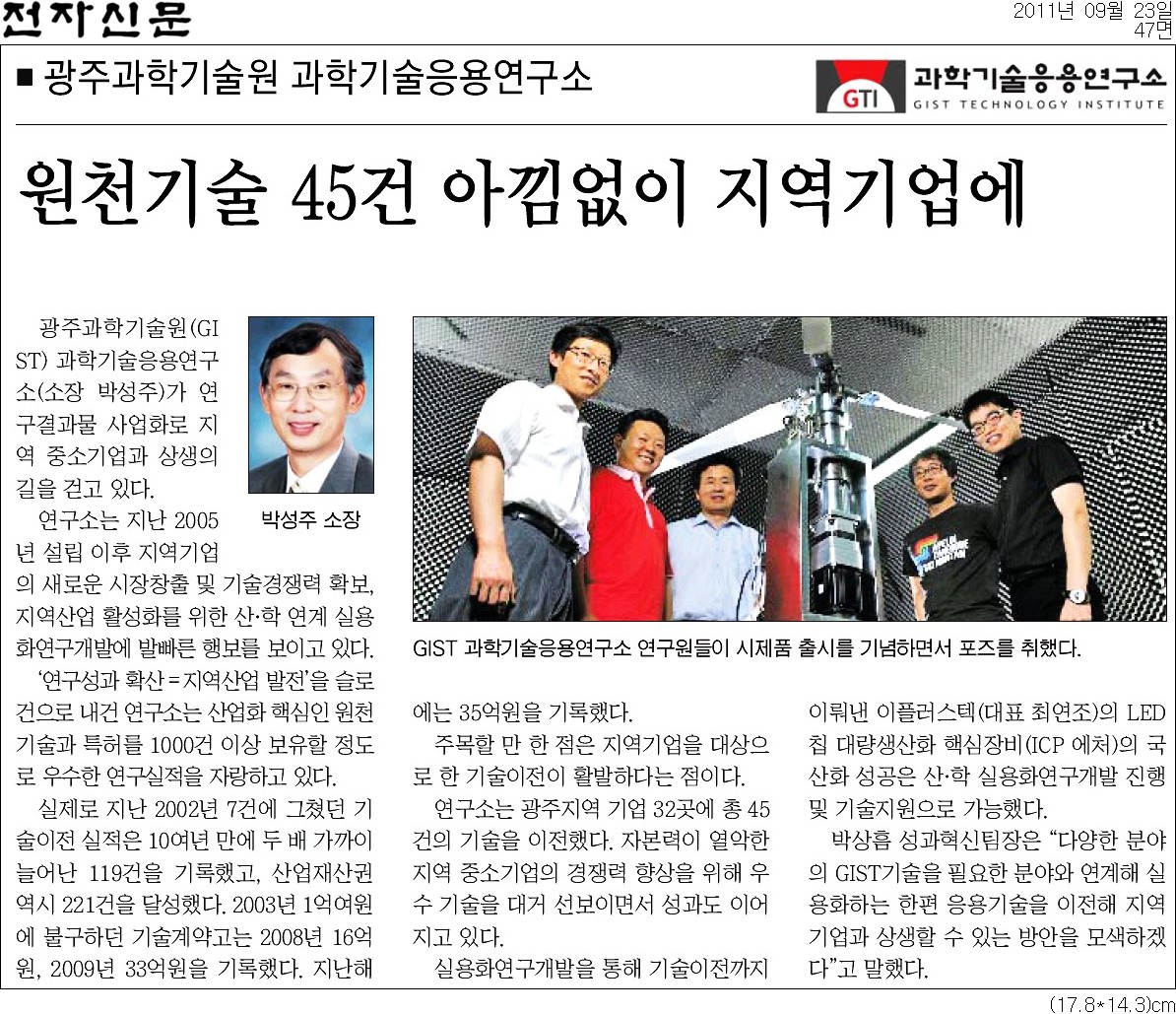 GIST(광주과학기술원, 총장 선우중호) 과학기술응용연구소(소장 박성주)가 연구결과물의 사업화를 통해 지역 중소기업과 상생의 길을 걷고 있다.