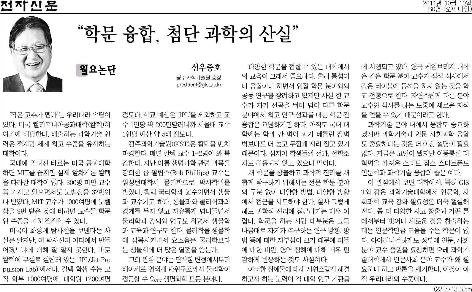 “학문 융합, 첨단 과학의 산실” [선우중호 총장 전자신문 기고]