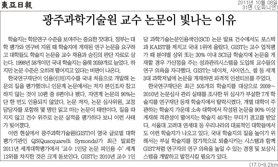 이런 현실에서 광주과학기술원(GIST)이 영국 글로벌 대학평가기관인 QS(Quacquarelli Symonds)가 최근 발표한 2011년 세계대학평가에서 ‘교수 1인당 논문 피인용 수’ 세계 12위를 차지한 것은 크게 돋보인다. GIST는 2010년 교수 1인당 과학기술논문인용색인(SCI) 논문 발표 건수에서도 포스텍과 KAIST를 제치고 국내 1위에 올랐다. GIST는 교수 업적평가 때 분야별 상위 또는 30% 이내 SCI급 학술지에 논문을 게재할 경우 가산점을 주는 성과관리시스템을 도입해 교수들의 연구 의욕을 자극했다. GIST는 네이처, 사이언스, 셀 등 세계 3대 과학저널에 논문을 게재하면 파격적 인센티브를 주었다.