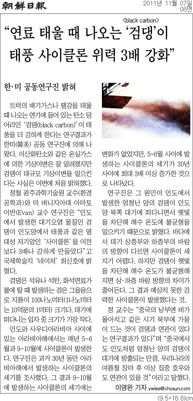 미국 버지니아공대 아마토 에반 교수와 광주과학기술원 환경공학과 정철 교수 공동연구팀은 인도에서 발생하는 블랙카본의 증가가 태풍과 같은 ‘사이클론’의 세기를 증가시킨다고 ‘네이처誌(하이라이트)’ 3일자에 발표했다.