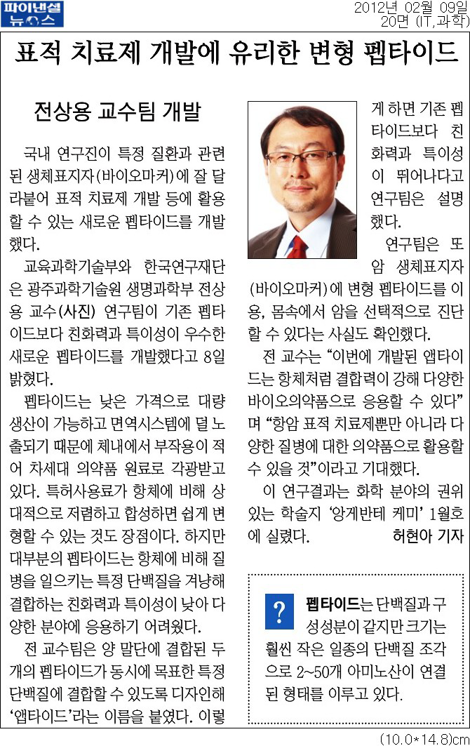 전상용 교수는 "이번에 개발된 앱타이드는 항체처럼 결합력이 강해 다양한 바이오 약품으로 응용될 수 있다"며 "앞으로 항암 표적치료제뿐만 아니라 다양한 질병에 대한 의약품으로 활용될 수 있을 것"이라고 기대했다.
