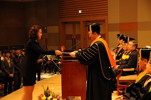 <사진설명: 광주과학기술원 선우중호 총장이 2일 개최된 2012학년도 입학식에서 학생대표 김정은(생명과학부 박사과정) 입학생으로부터 입학선서문을 전달받고 있다.>