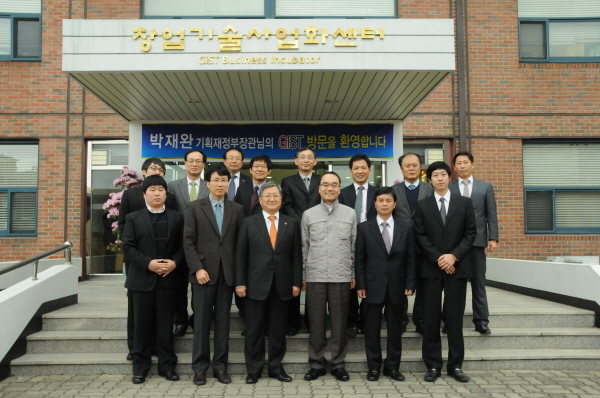 박재완 기획재정부 장관이 2일 GIST(광주과학기술원, 총장 선우중호)를 방문하여 창업기술사업화센터 내 입주기업을 둘러보면서 창업 기업인을 격려하고, 교수 및 학생 창업자와 간담회 시간을 가졌다.