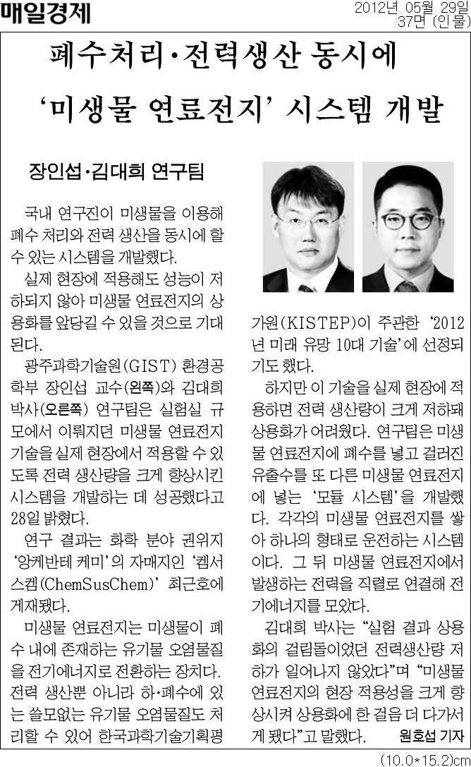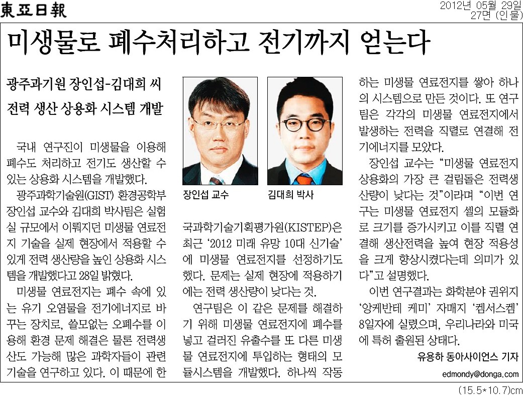교육과학기술부는 28일 장인섭(45) 광주과기원 교수와 김대희 박사가 실제 폐수처리공정에 적용할 수 있는 미생물연료전지 기술을 개발하는데 성공했다고 밝혔다.