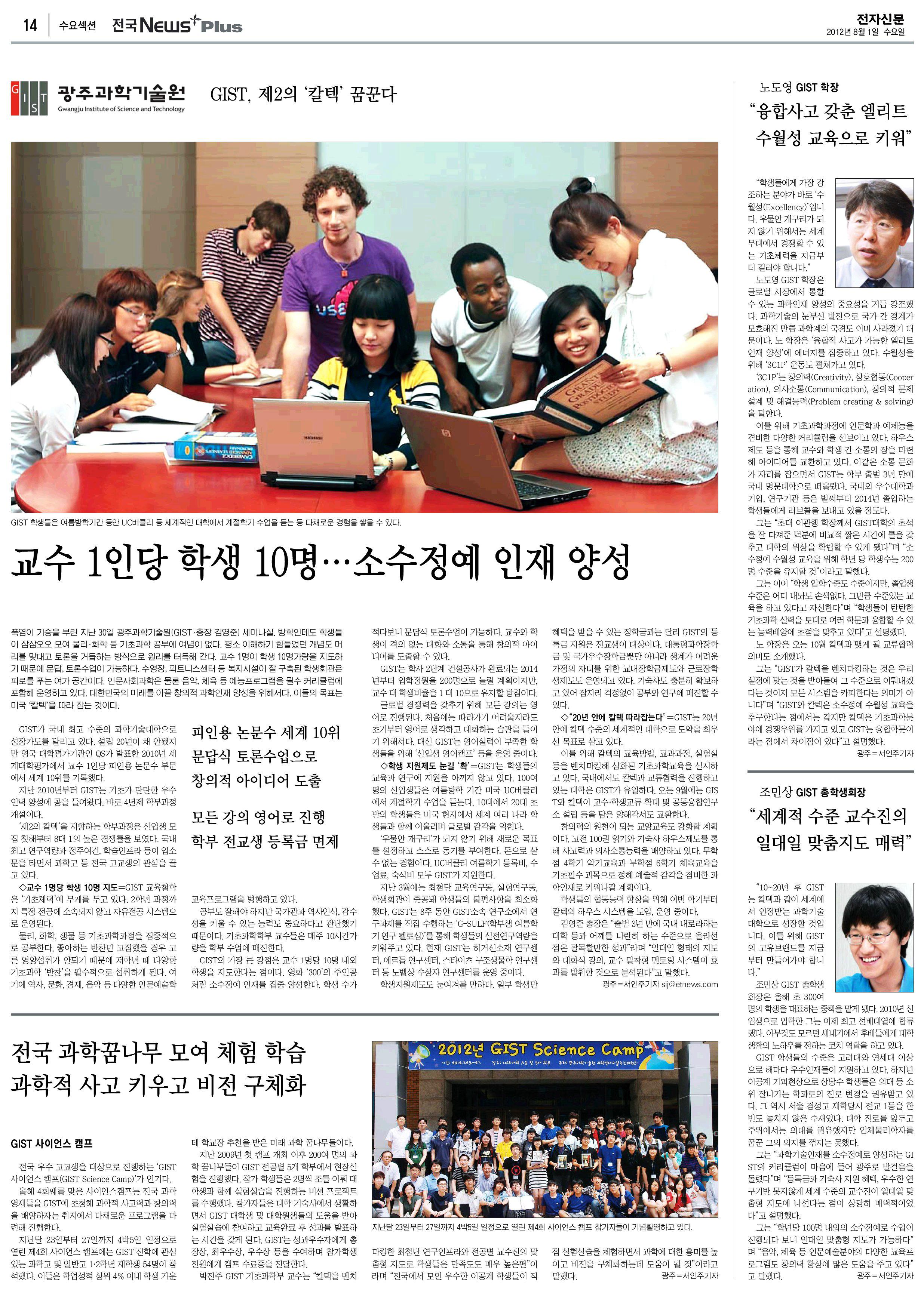 폭염이 기승을 부린 지난 30일 광주과학기술원(GIST, 총장 김영준) 세미나실. 방학인데도 학생들이 삼삼오오 모여 물리·화학 등 기초과학 공부에 여념이 없다. 평소 이해하기 힘들었던 개념도 머리를 맞대고 토론을 거듭하는 방식으로 원리를 터득해 간다. 교수 1명이 학생 10명 가량을 지도하기 때문에 문답, 토론수업이 가능하다. 수영장, 휘트니스센터 등 복지시설이 잘 구축된 학생회관은 피로를 푸는 여가 공간이다. 인문사회과학은 물론 음악, 체육 등 예능프로그램을 필수 커리큘럼에 포함해 운영하고 있다. 대한민국의 미래를 이끌 창의적 과학인재 육성을 위해서다. 이들의 목표는 미국 "칼텍"을 따라 잡는 것이다.