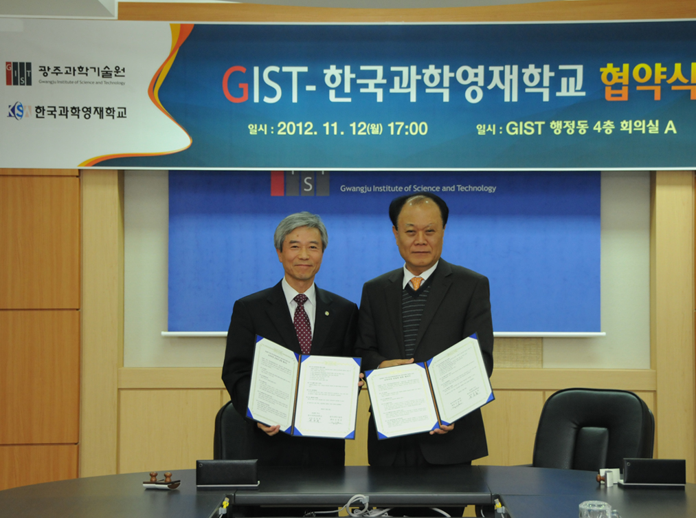지스트는 또 같은 날 오후 KAIST 부설 한국과학영재학교(KSA·교장 권장혁)와도 AP 과목 지원 및 학점 인정과 국내·외 교류 프로그램 운영 지원, 도서관 이용 지원 등을 약속하는 협약식을 개최했다.
