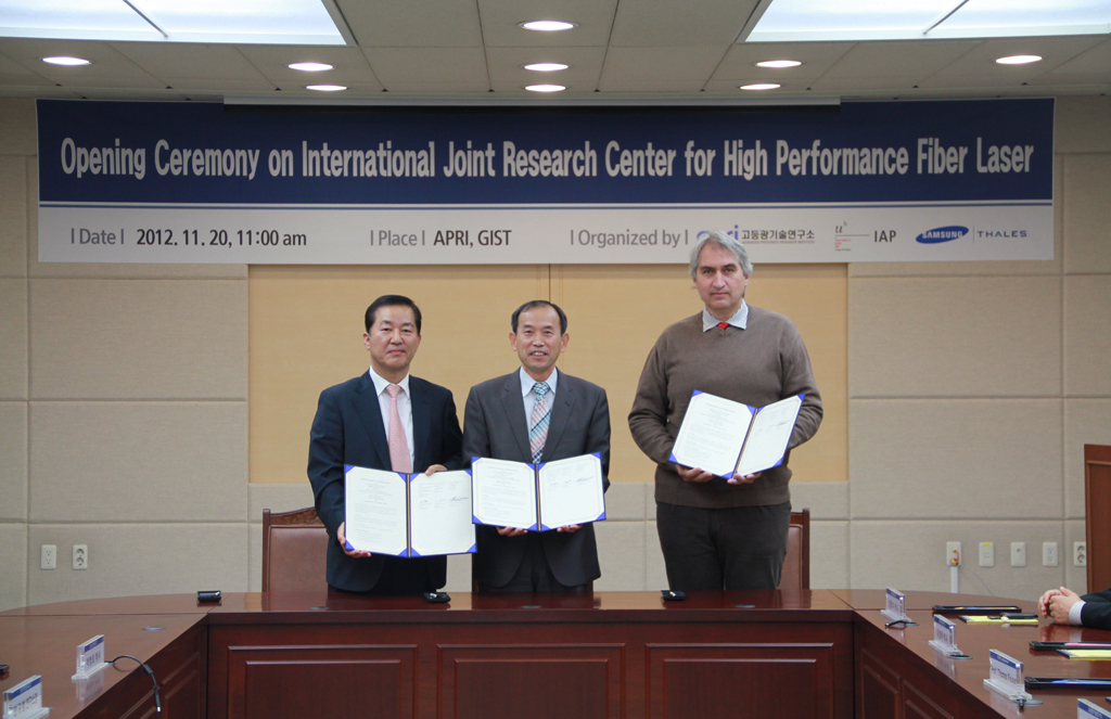 지스트 고등광기술연구소가 주관하고 스위스 베른대학 응용물리연구소(IAP)와 삼성탈레스㈜가 참여해 설립한 고성능광섬유 레이저국제공동연구센터는 오는 2018년까지 첨단 마이크로 산업, 우주항공 및 국방 분야에 적용이 가능한 고출력, 고에너지 광섬유 레이저 기술을 개발하고, 광섬유 레이저 시스템 관련 요소기술을 확보할 계획이다. 이러한 광섬유 레이저 시스템은 극한의 환경조건에서 안정적인 동작이 가능한 고부가가치 산업일 뿐만 아니라 우주항공 및 국방 분야에서 차세대 무기개발에 활용하기 위해 반드시 확보해야 할 유력한 핵심기술이다.