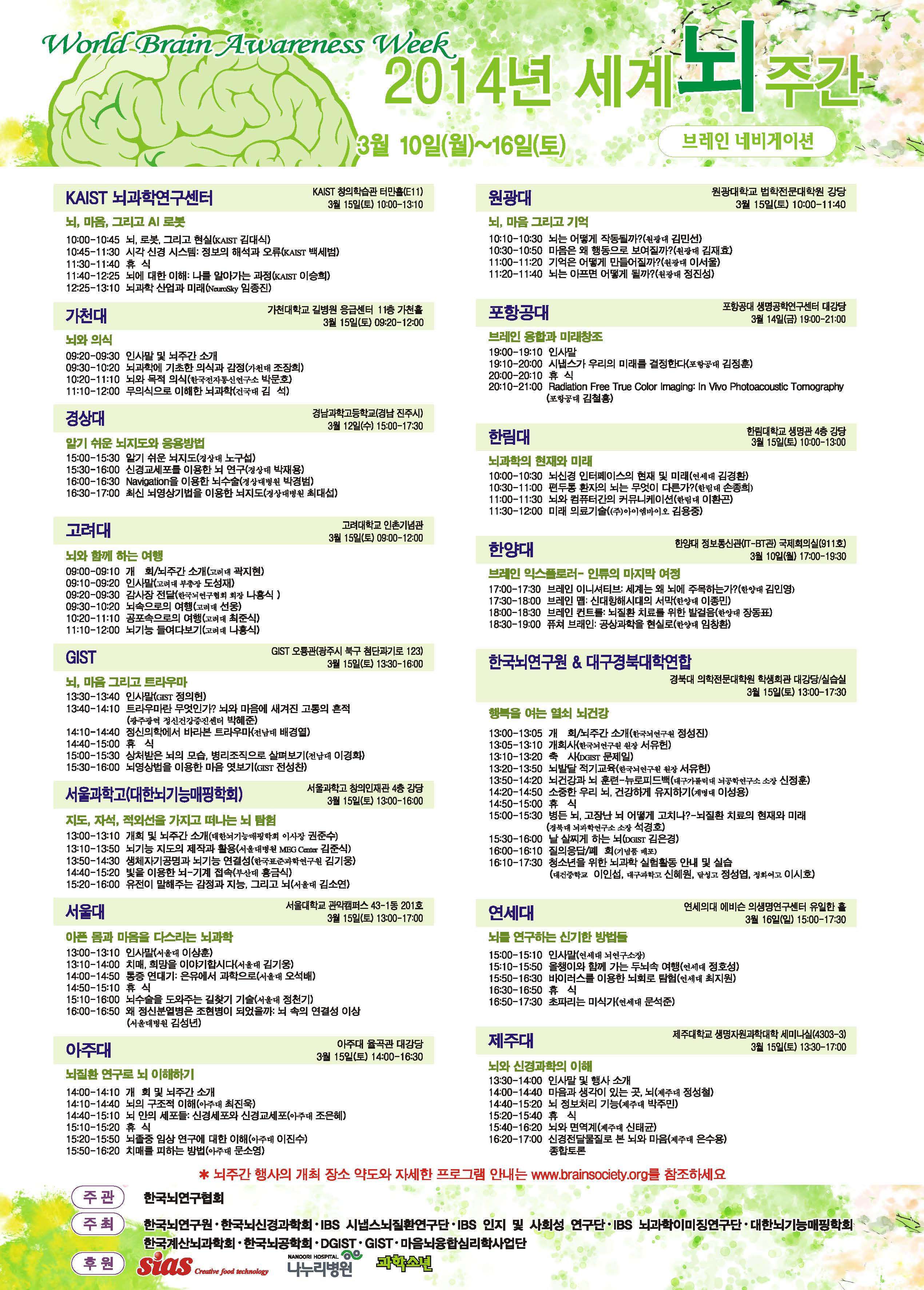 □ 지스트(GIST·광주과학기술원·총장 김영준)가 ‘2014년 세계 뇌 주간(3월10~16일)’을 맞아 오는 15일 오후 과학고 등 광주지역 중‧고교생과 대학생, 일반인을 대상으로 뇌과학의 중요성과 연구성과를 공유하기 위한 공개강연을 마련한다.