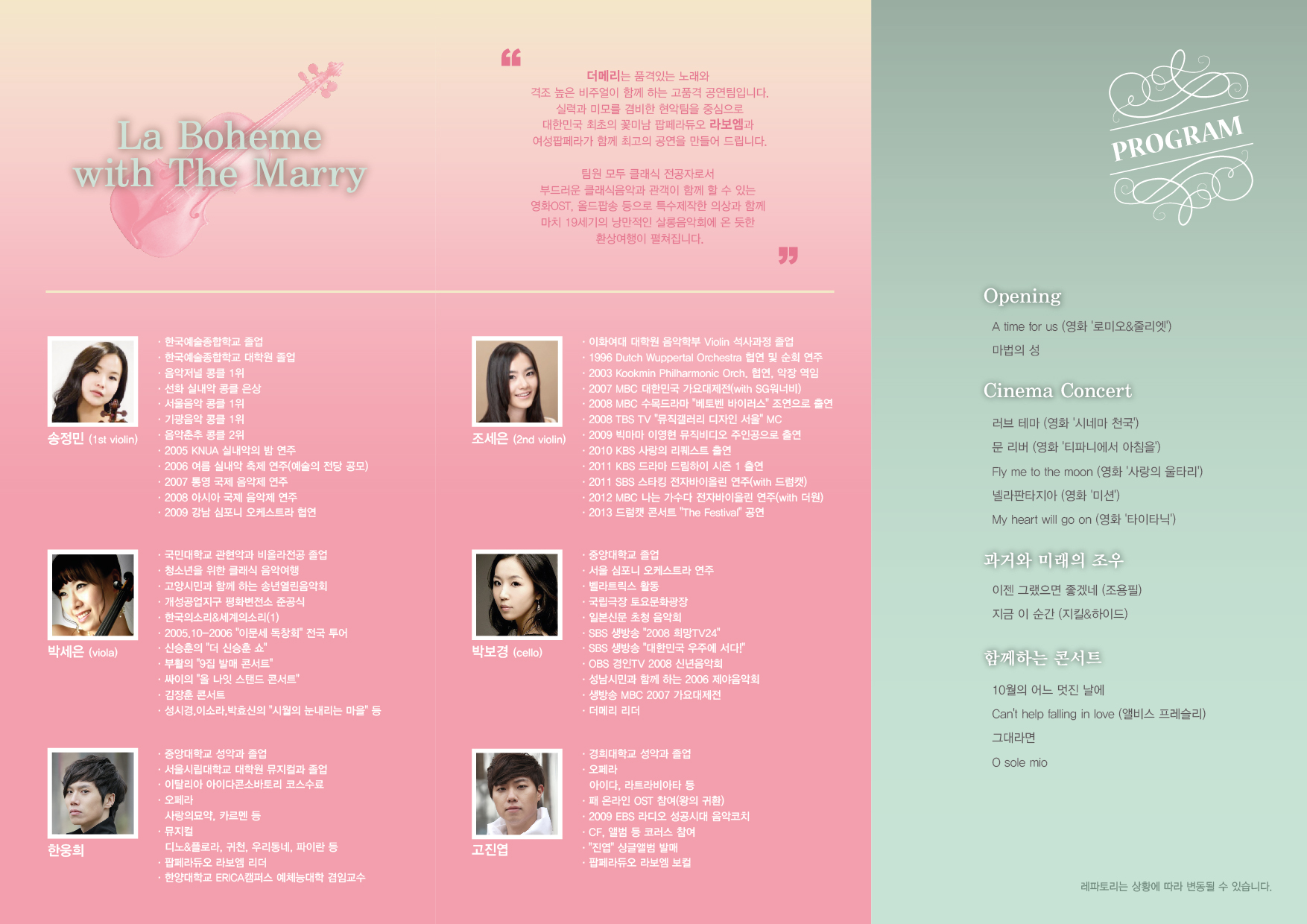 ○ 남성 팝페라 듀오인 ‘라 보엠’과 현악 앙상블 4중주인 ‘더 메리’가 출연하는 이번 공연은 부드러운 클래식 음악은 물론 관객과 함께 할 수 있는 영화 OST, 올드 팝송 등의 친근한 선율을 선보이며, 특수 제작한 의상 연출을 통해 19세기 살롱음악회에 온 듯한 분위기의 음악여행을 선사한다.