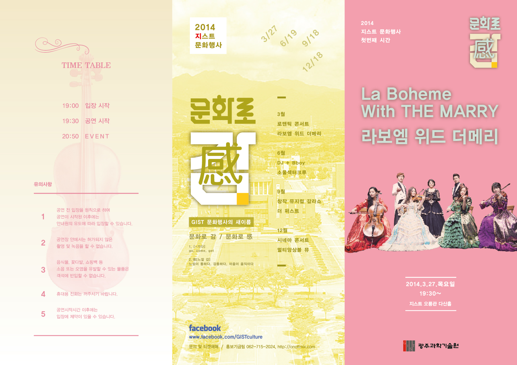 ○ ‘문화로 감(感)’이라는 타이틀로 진행될 2014년 지스트 문화행사는 3월 ‘라 보엠 위드 더 메리"를 시작으로, 디제잉와 비보이가 함께하는 역동적인 공연(6월), 더 퍼스트(The First)와 함께 하는 창작뮤지컬 갈라공연(9월), 영화음악과 함께 하는 시네마 콘서트(12월) 등 매회 다양한 형식의 공연을 선보일 예정이다.