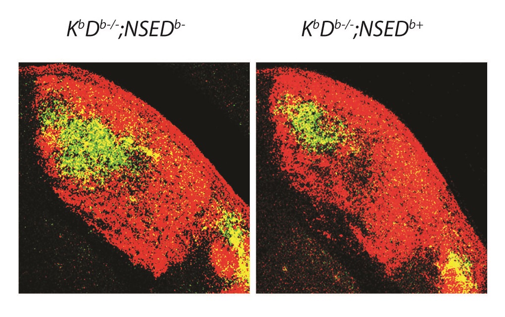 (오른쪽) 이 쥐의 뇌에 H2-Db만을 다시 발현시켰을 경우, 노란색 부분이 줄고 있음을 보여주는데, 이는 두 눈에서