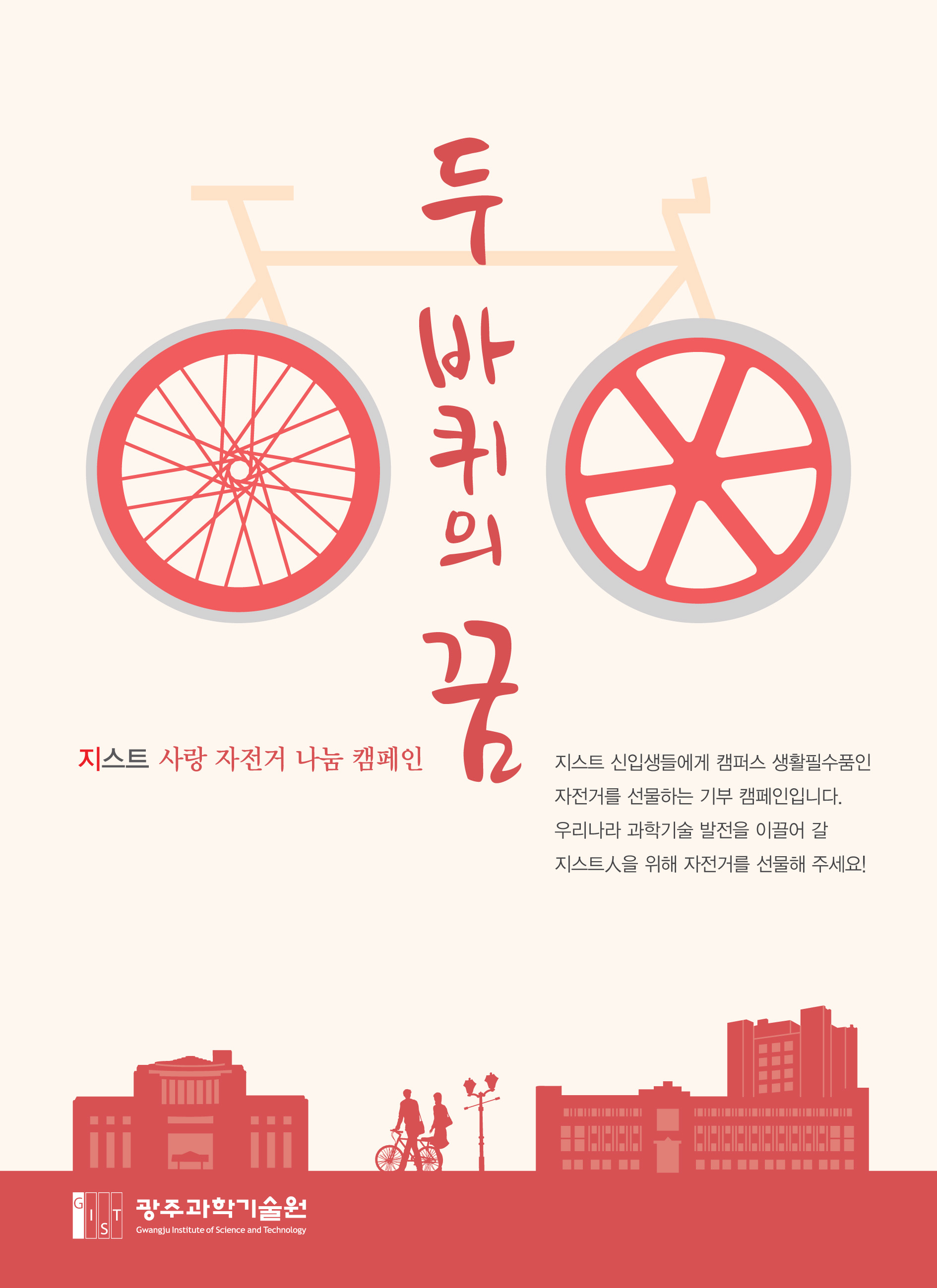 지스트 신입생들에게 생활필수품인 ‘자전거’를 선물하는 기부 캠페인입니다. 완전한 평지에다 차량 통행이 상대적으로 적은 우리 원 캠퍼스는 자전거 타기에 매우 좋은 조건을 갖추고 있습니다. 이것이 설립 초부터 전교생에게 자전거를 무상으로 나눠주고 이용하도록 한 이유입니다. 자전거 두 바퀴를 굴리며 지스트 캠퍼스를 누빌 대학(원) 신입생들을 위해 자전거를 선물해 주세요! 기부하신 자전거에는 후원자님의 이름을 스티커로 제작하여 부착할 예정입니다.