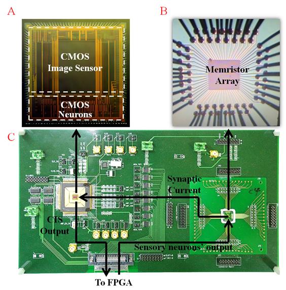 o CMOS 이미지 센서와 인공신경망은 인쇄 회로 기판(printing circuit board) 위에서 뉴로모픽 화상인식 시스템(그림1-D)으로 통합돼 구동하게 된다.