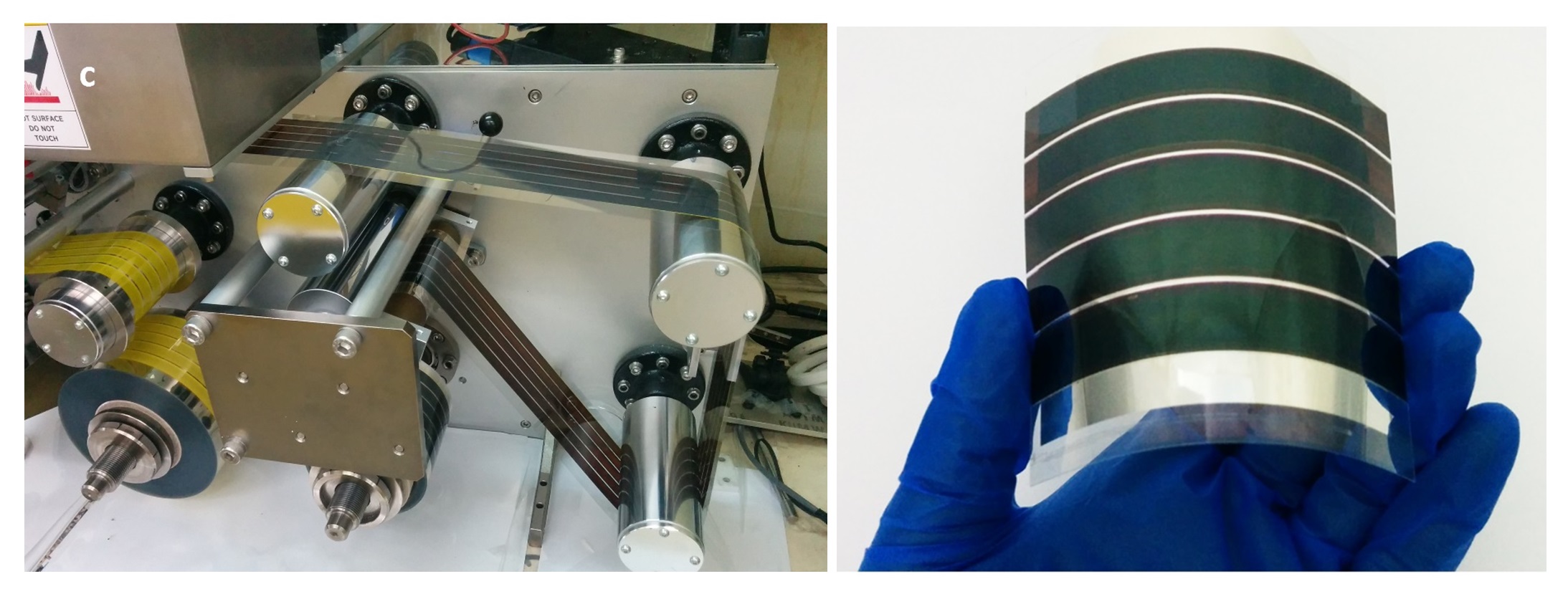(그림 2) 슬롯다이코팅 공법으로 제작한 페로브스카이트 태양전지 모듈의 롤투롤 공정 제작 모습 (왼쪽). 롤투롤 공정으로 생산된 플렉시블 페로브스카이트 태양전지 대면적(40 cm2) 모듈 사진 (오른쪽).