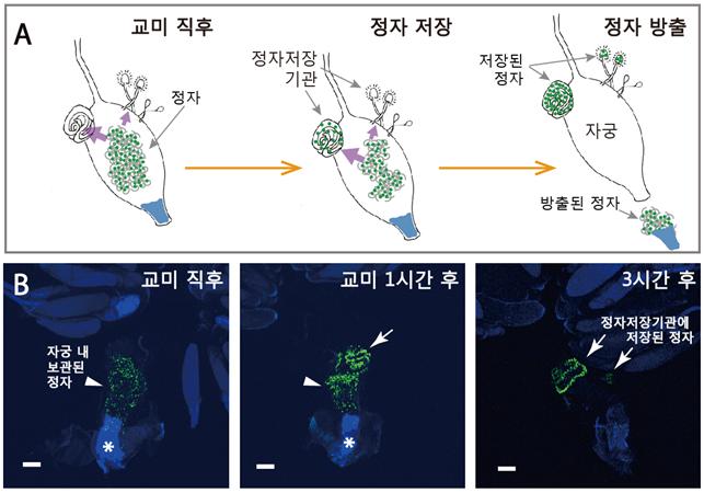 (A) 초파리 암컷이 교미 후 정자를 저장․방출하는 과정을 그린 그림. 교미를 통해 암컷에게 전달된 정자와 정액은 먼저 자궁에 보관되고, 정자들은 정자저장기관인 seminal receptacle과 한 쌍의 spermathecae로 이동해 저장된 후 난자와 수정을 하게 된다. 저장하고 나머지 필요 없는 정자들은 교미 후 약 1~6시간 사이에 배출된다.