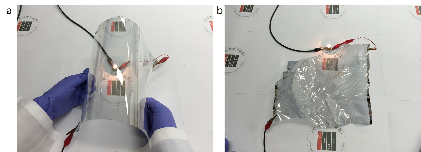 (그림 1) A4 크기의 플렉시블 투명전극의 유연성을 보여주는 실험 모습. 휘어진 상태(a)에서도 전구가 켜지며, 같은 투명전극을 종이처럼 구긴 후(b)에도 정상적으로 작동하는 것을 볼 수 있다.