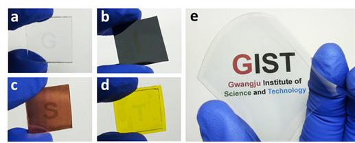 (a)유리 (b)실리콘 (c)금속 호일 (d)테이프 (e)플라스틱 기판 등 다양한 물질 표면에 균일하게 전사된 고성능 플라스틱 투명전극의 사진. (a~d) 요철 구조를 가진 스탬프를 이용하여 전사하면 손쉽게 다양한 모양 (사진에서는 순서대로 G, I, S, T)의 박막을 형성할 수 있음. (e) 스탬프의 크기를 증가시키면 대면적의 전사도 가능함