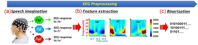 ∘ 연구팀은 피실험자(학생)가 아(a), 이(i), 우(u)의 세 가지 음성을 상상으로 발음했을 때 발생하는 뇌파 신호를 측정한 뒤, 신호처리 과정을 거쳐 특징을 분류하고 하드웨어 신경망의 입력신호로 사용할 수 있도록 32비트 2진 코드로 변환했다. (그림1 참고)