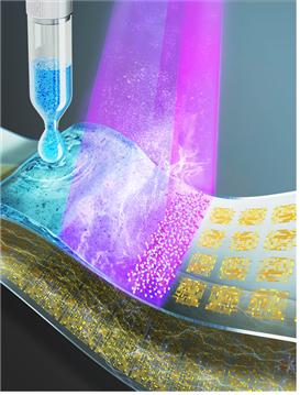 (그림 2) 광처리를 통한 용액공정 산화물 전자소자 제작과정 모식도. 플라스틱 기판위에 용액공정 산화물을 코팅, 자외선 광처리를 통해 빠르게, 불순물이 제거되고, 원자간 결합 네트워크가 조밀화 됨을 보여줌. 이후 상황에 따라 요구되는 전극을 올려, 최종적으로 유연한 고품질의 산화물 전자소자를 구현