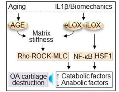 o 연골조직의 노화가 일어나면서 최종당화산물(AGE·Advanced Glycation End-product)이 연골 조직에 축적되고 연골콜라젠의 교차결합이 진행되면 이로 인해 세포외 기질의 경화가 일어난다. 반면 관절에 가해지는 물리적 스트레스는 기질결합 효소인 락스 (LOX, lysyl oxidase)의 발현 증가와 세포외 기질의 경화를 가져온다. 이와 같은 세포외 기질의 경화는 연골세포에 기계적 신호전달체계(Mechanotransduction)를 활성화시킨다.