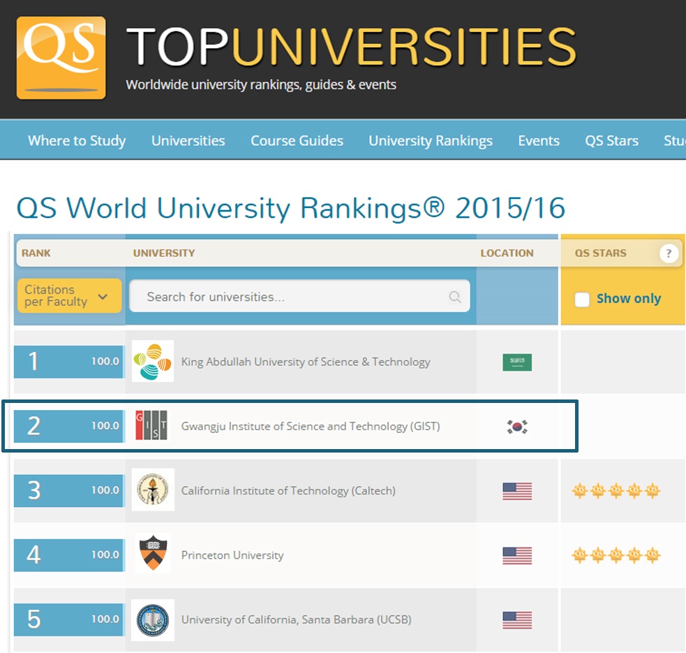 □ 영국의 글로벌 대학 평가 기관인 QS(Quacquarelli Symonds)가 9월 14일 발표한 ‘2015 세계 대학 평가’에서 GIST(광주과학기술원·총장 문승현)가 ‘교수 1인당 논문 피인용 수(Citations per Faculty)’ 부문 세계 2위로 평가됐다.