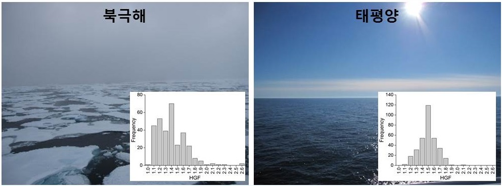 (그림 1) 북극해(왼쪽)와 태평양에서 각각 관찰한 초미세먼지 흡습성과 혼합 상태 특성을 보여주는 그래프. (HGF는 상대습도 증가에 따른 입자의 성장률로 입자의 흡습성을 나타내는 대표적 지수임. 북극해(왼쪽)에는 HGF가 다양하게 분포되어 있어 흡습성을 가진 다양한 성분이 포함되어 있다는 것을 암시)