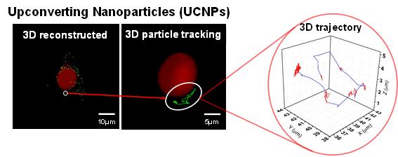 * 업컨버팅 나노입자(UCNP) : 근적외선(980nm)을 이광자 흡수(two-photon upconversion)한 후 가시광선 (525, 545, 650nm)을 방출하는 나노 입자. 광안정성(photostability)이 높고 세포 독성이 낮은 특징을 지니고 있어 수 시간 동안 연속적으로 세포 촬영을 할 수 있다. 또한 광원으로 근적외선을 사용하기 때문에 세포 내에서 자기형광(autofluorescence)이 발생하지 않아 세포 내 배경 잡음이 대폭 감소된다. 이번 연구에서는 지름이 30nm이며 란탄계열의 이온이 도핑돼 있는 나노 입자가 사용되었다.