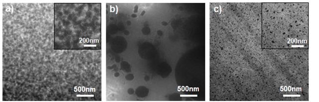 <그림 1> 유기분자망과 폴리아믹산의 혼합용액에서 얻어지는 재배열된 유기분자망/폴리이미드 나노복합막 필름. (a) 폴리아믹산의 질량 분률 0.4일 때 나타나는 복연속직인 나노복합막 구조. (b) 폴리아믹산의 질량 분률 0.6일 때 거시적인 상분리 구조. (c) 폴리아믹산의 질량 분률 0.9일 때 고립된 유기분자망 상을 가지는 상분리 구조. 재배열된 유기분자망/폴리이미드 필름의 구조는 유기분자망과 폴리이미드의 전구체인 폴리아믹산을 혼합할 때의 그 질량 분률에 따라 구조가 달라진다. 따라서 폴리아믹산의 질량 분률에 따라 변하는 재배열된 유기분자망/폴리이미드 필름의 모폴로지를 투과전자현미경으로 관찰하였고, 각 상이 상호연결된 구조는 폴리아믹산의 질량 분률이 0.5 이하에서 얻을 수 있었다. 폴리아믹산 질량분률 0.5 초과~0.8 미만에서는 거시저긴 상분리 구조의 필름이 얻어지며, 폴리아믹산 질량분률 0.8 이상에서는 고립된 유기분자망 상을 가지는 필름을 얻을 수 있다.
