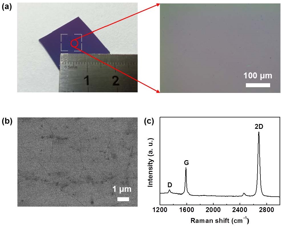 (그림 1) (a)상압화학기상증착법으로 300℃의 저온에서 합성한 그래핀의 디지털 사진(왼쪽)과 광학현미경 이미지(오른쪽). 광학현미경 이미지에서 콘트라스트가 일정한 것으로 보아 연속적인 박막 형태의 그래핀이 대면적으로 균일하게 합성되었음을 알 수 있음. (b)주사전자현미경 이미지 (c)라만 스펙트럼. 라만스펙트럼을 분석한 결과 D 피크와 G 피크의 세기 비율(ID/G)이 0.1 이하로 매우 낮고, 2D 피크와 G 피크의 세기 비율(I2D/G)이 2.0 이상으로 나타나 고품질의 단층 그래핀이 합성되었음을 알 수 있음.