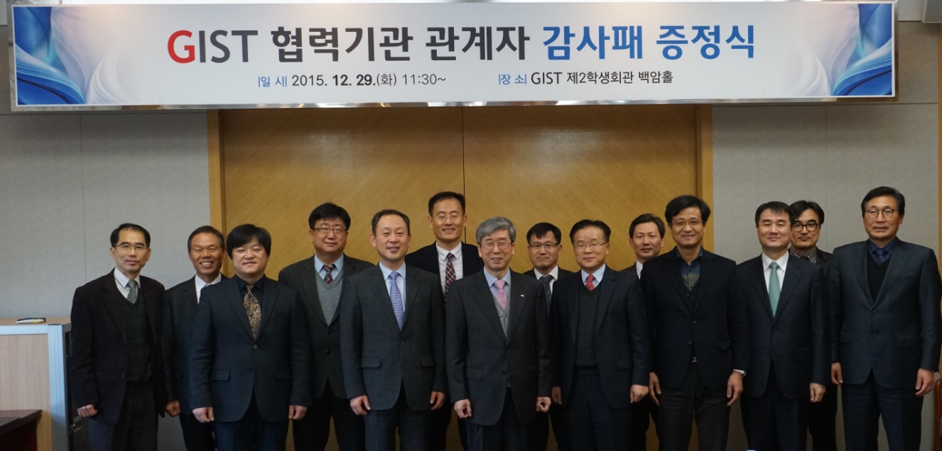 GIST는 지난 2015년 12월 29일(화) 협력기관 관계자 초청 오찬을 개최하고 감사패를 전달한 바 있으며, 2월 11일(목) 광주광역시청 유용빈 경제산업국장, 박정환 에너지산업과장 등 관계자에게 감사패를 전달하였다.
