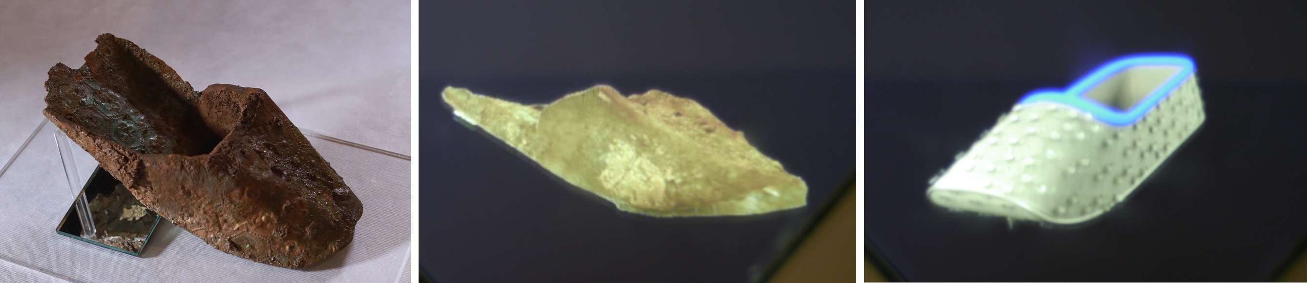 마한시대 금동신발 실제 모습(맨 왼쪽)과 홀로그램으로 차례로 복원된 모습(중앙 및 맨 오른쪽)
