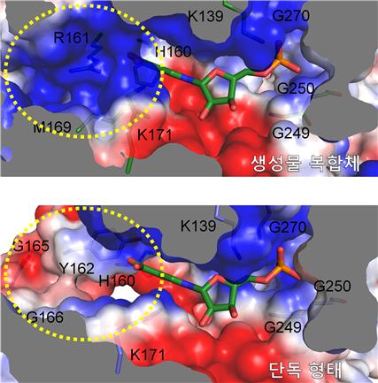 [그림 4] QPRT의 생성물 복합체(위) 및 단독 형태(아래)의 생성물 결합부위 구조 및 전하도 비교. 생성물 복합체 구조(위)에서 양전하를 띠는 아미노산 잔기에 의해 반응물 결합부위가 닫혀 있는 반면, 단독 형태(아래)에서는 구조적 변화로 인해 열린 공간이 형성된다.