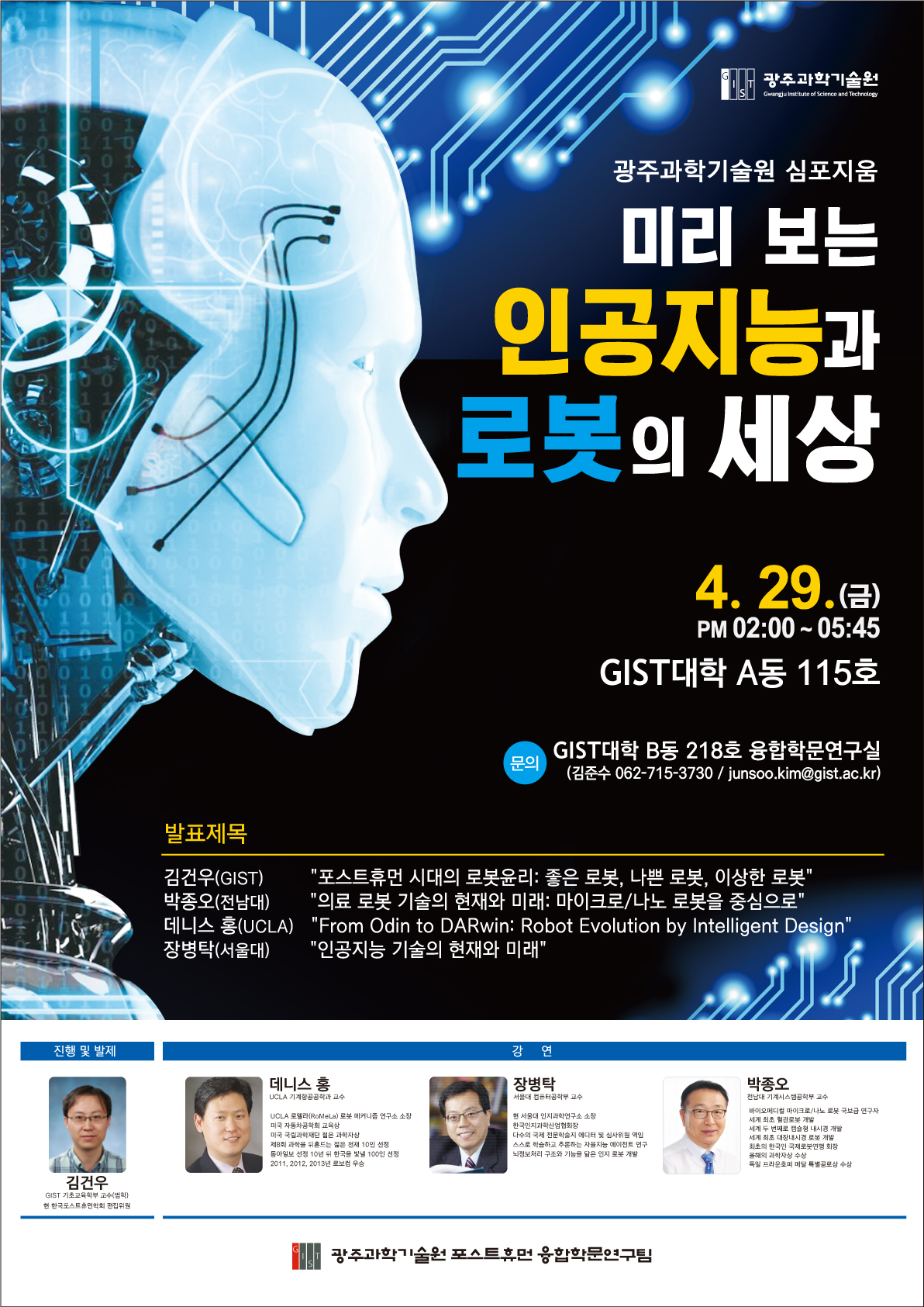 ◦ GIST 포스트휴먼 융합학문연구팀은 오는 4월 29일(금) 오후 2시부터 6시까지 학사과정인 GIST대학 A동(115호)에서 「미리 보는 인공지능과 로봇의 세상」을 주제로 전문가 4명의 특강을 진행하는 심포지엄을 개최한다.